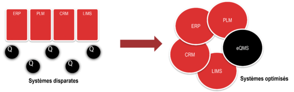Par ailleurs, l’harmonisation des processus métiers et des données de management de la qualité est très complexe à réaliser dans l’ensemble de l’organisation lorsque des systèmes cloisonnés sur papier ou des systèmes disparates, comme représentés ci-dessus, sont maintenus.